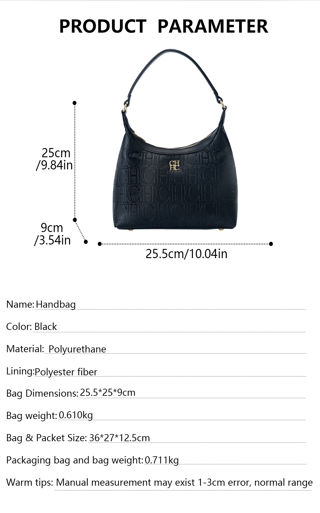 CHCH women’s solid color shoulder bag large capacity letter design daily commuter handbag